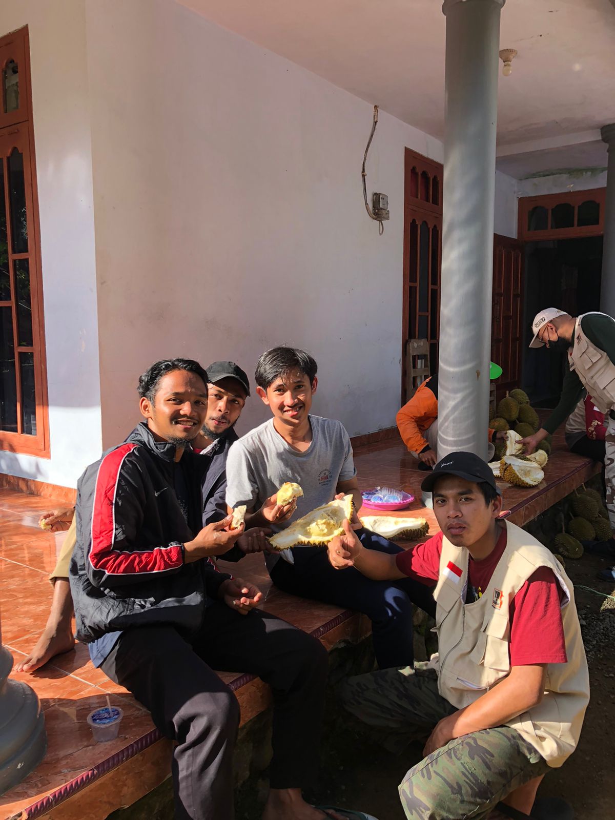 Selesai membagi sembako, kelompok ini bergabung dengan relawan YBM PEDULI untuk pulang bersama-sam ke Malang. Dalam perjalanan pulang, para relawan sempat mampir ke rumah salah satu relawan lokal, akhi Beni Irawan yang berada di Desa Lebak Harjo kecamatan Ampelgading Kabupaten Malang. Di lokasi tersebut merupakan daerah sentra/perkebunan durian. Dr. Abu Sholih mengajak kami untuk menikmati sedikit buah durian yang disuguhkan. kami mencoba mencicipi durian tersebut, alhamdulillah rasa nya nikmat.
